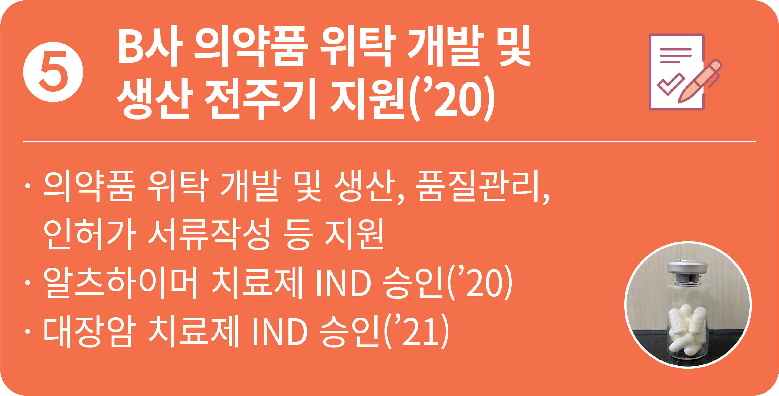 독자적인 의약품 생산시설의 구축·운영이 어려운 제약기업이나 연구기관 등에 의약품을 생산·공급하여 신약 연구개발 촉진 및 성공률 제고